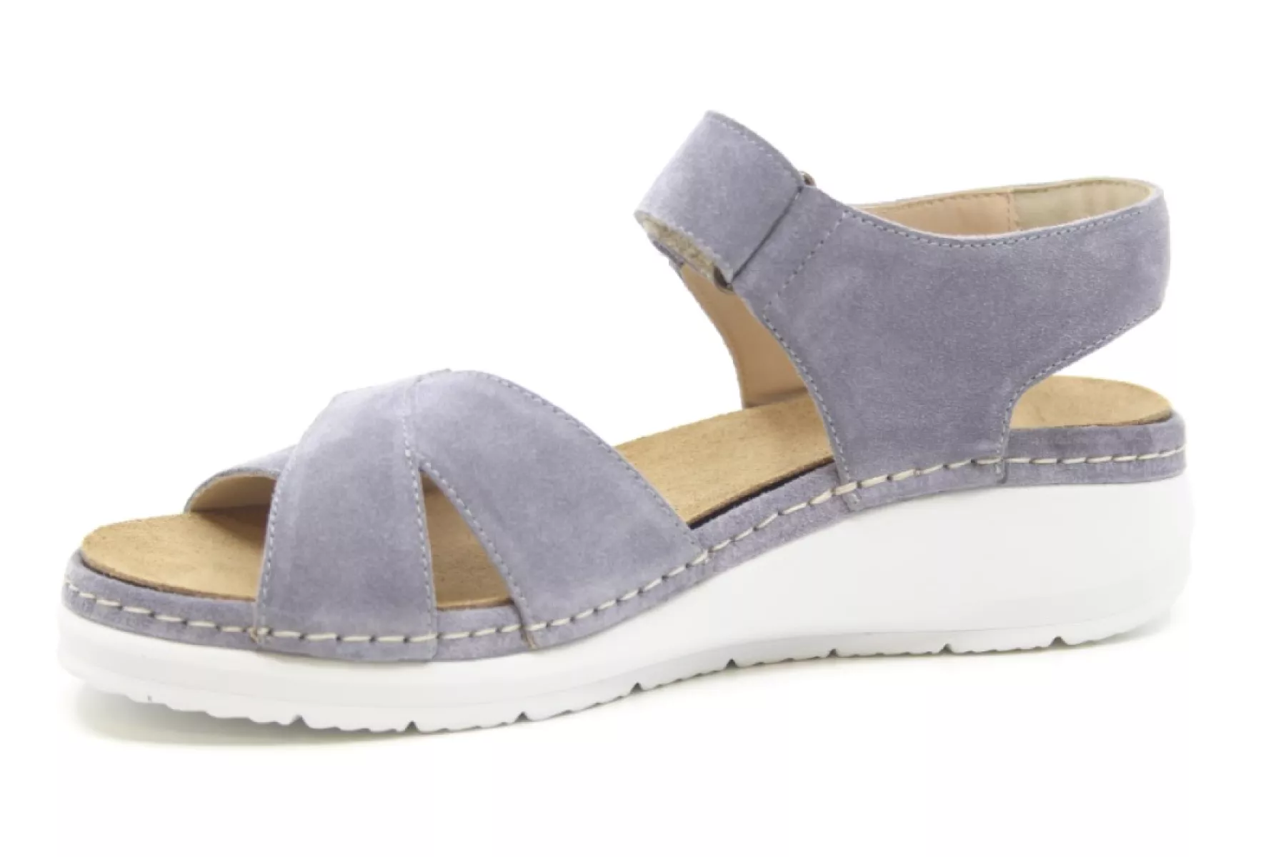 Vlotte lichtblauwe suède sandaal verstelbaar met klittenband.