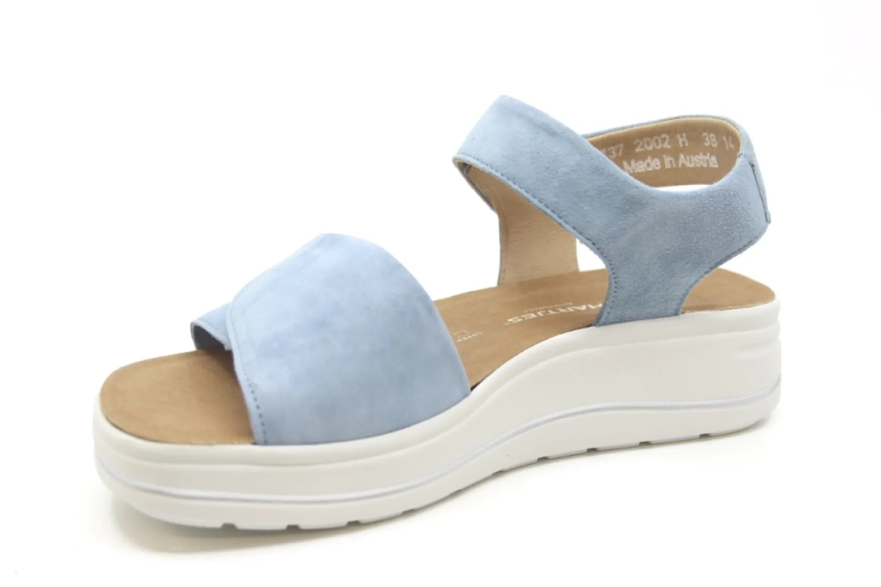 Model 132.2002 Woogie Sandal is een comfortabele lichtblauwe sandaal op een sleehak gemaakt van heerlijk soepel leer. Met een anatomisch gevormd uitneembaar kurken voetbed, dus ook geschikt voor je eigen steunzolen.