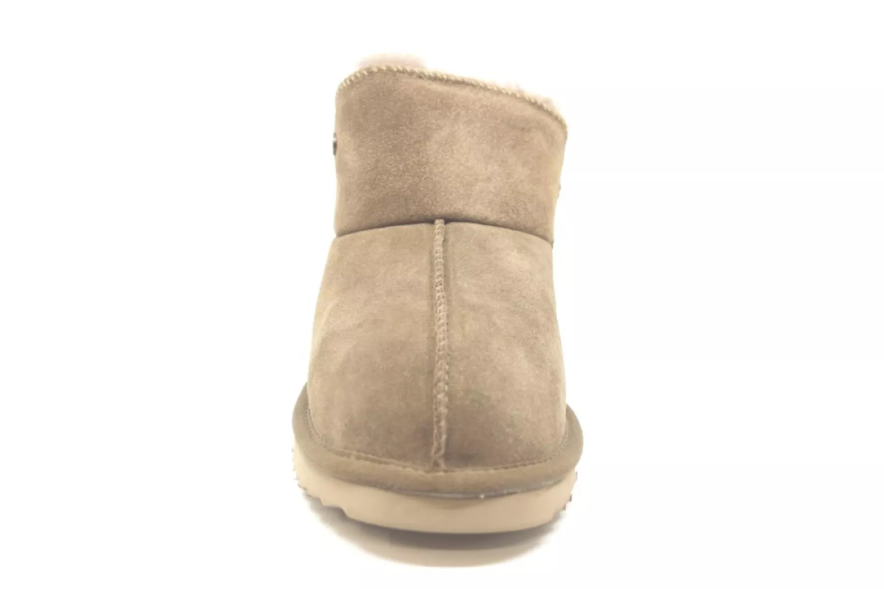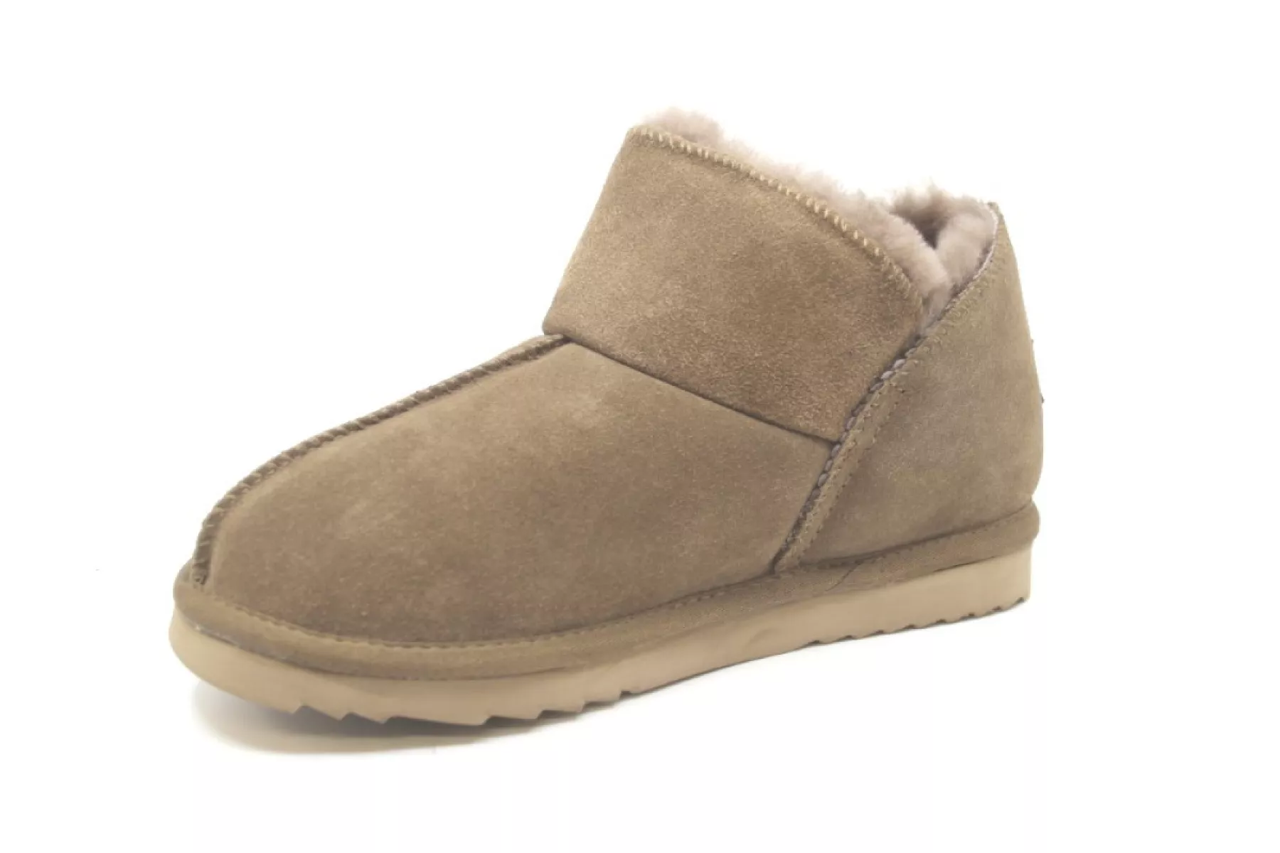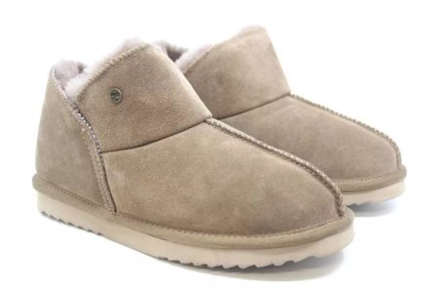 Mud/taupe kleurige suède dames pantoffel met heerlijk warme merino wol voering.
