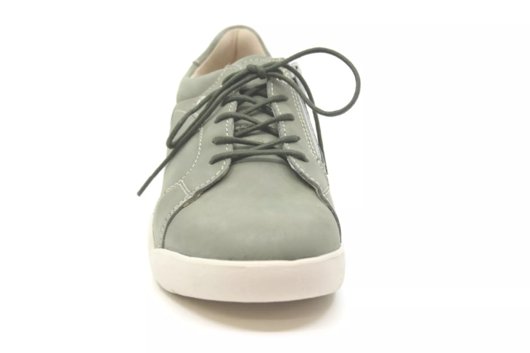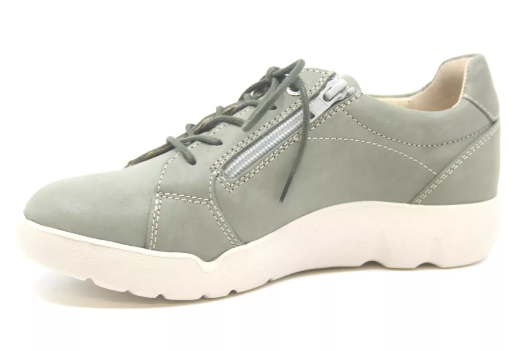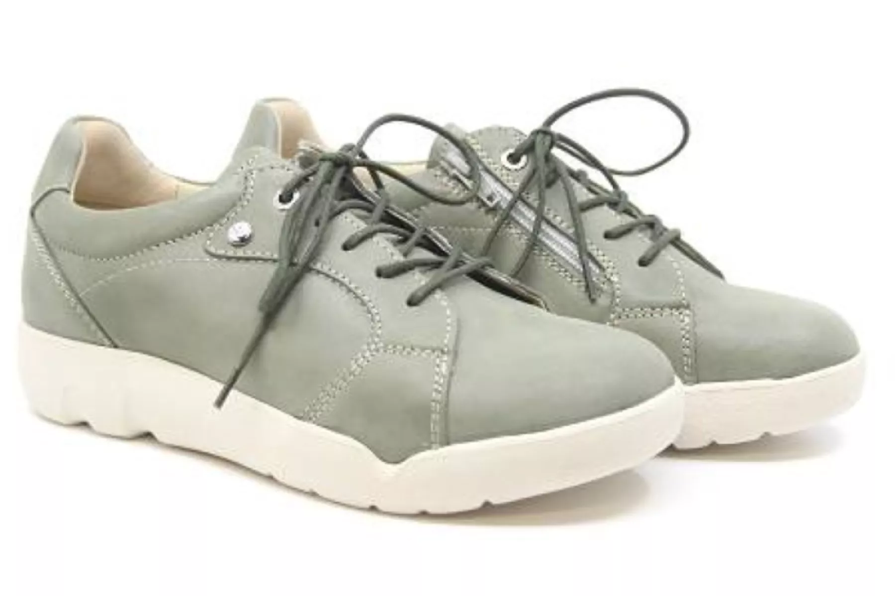 Sage/groen leren dames veterschoen met uitneembaar voetbed, afrolneus en PU zool.